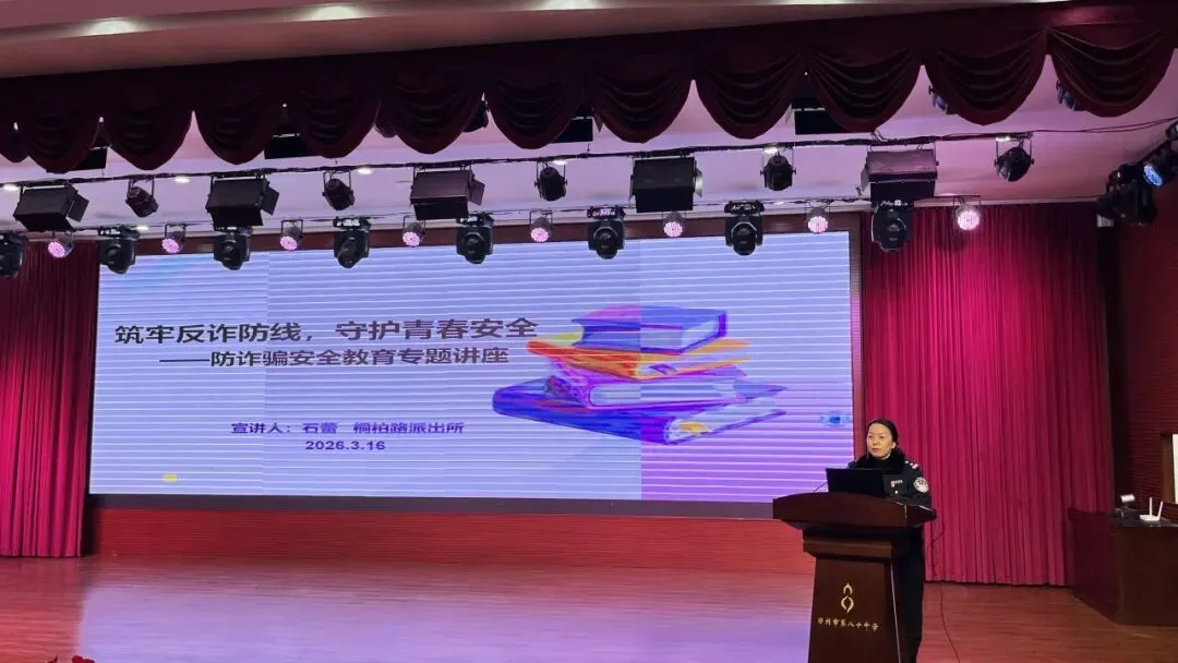 反诈护航成长,安全牢记心间。为切实增强青少年反诈防骗意识,提升学生对电信网络诈骗的识别与防范能力,从源头筑牢校园反诈安全防线,3月16日,郑州市第八十中学特邀中原区桐柏路派出所民警石蕾开展防诈骗安全教育专题讲座,为八年级学子送上一堂实用的反诈安全课。