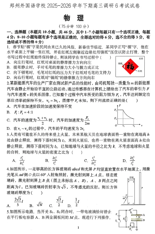 【河南卷】百强校丨河南郑州市外国语学校2026届高三下学期3月阶段检测