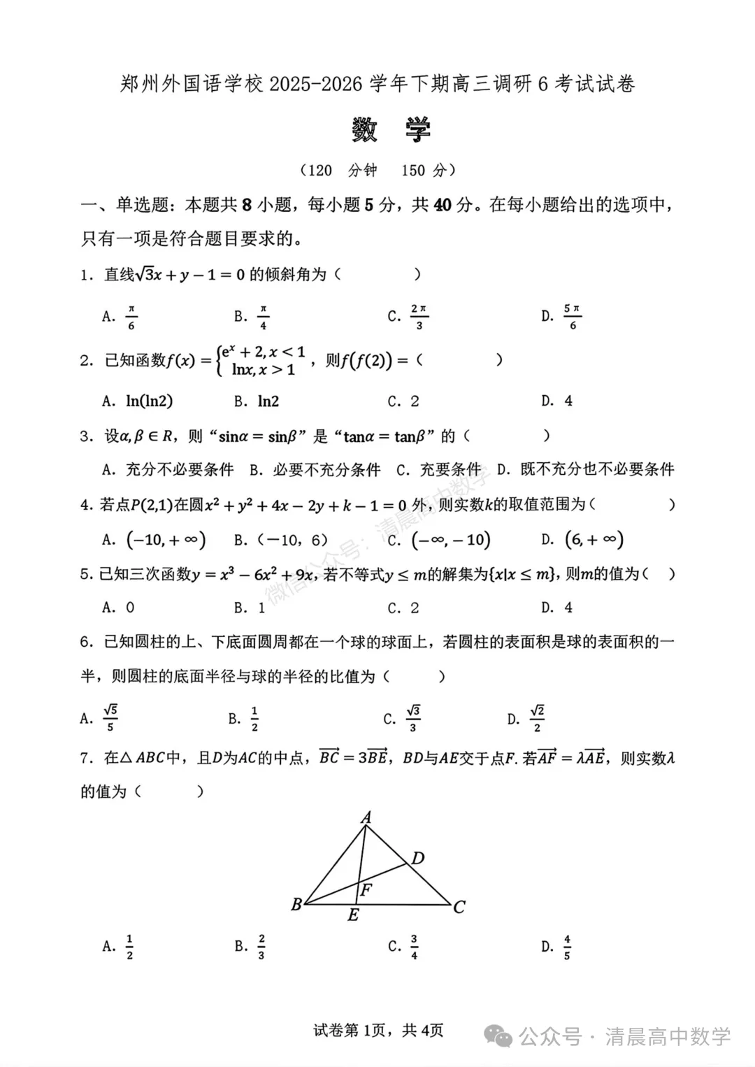 【高三】河南省郑州外国语学校2026届高三下学期调研6考试数学含解析(word版)