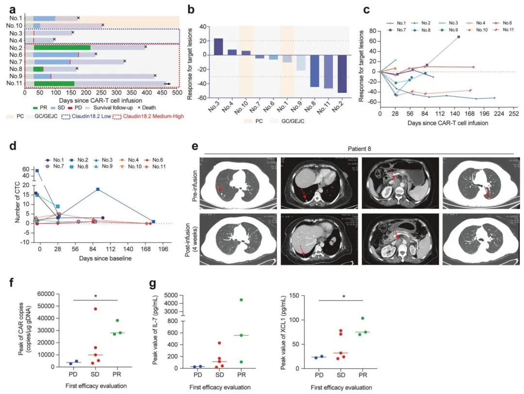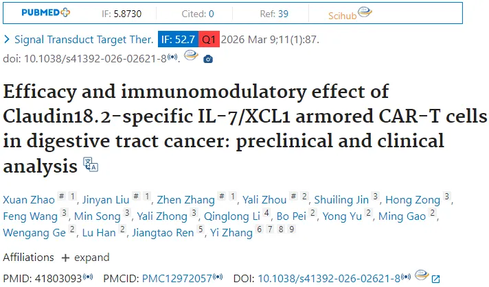 标题:Efficacy and immunomodulatory effect of Claudin18.2-specific IL-7/XCL1 armored CAR-T cells in digestive tract cancer: preclinical and clinical analysis