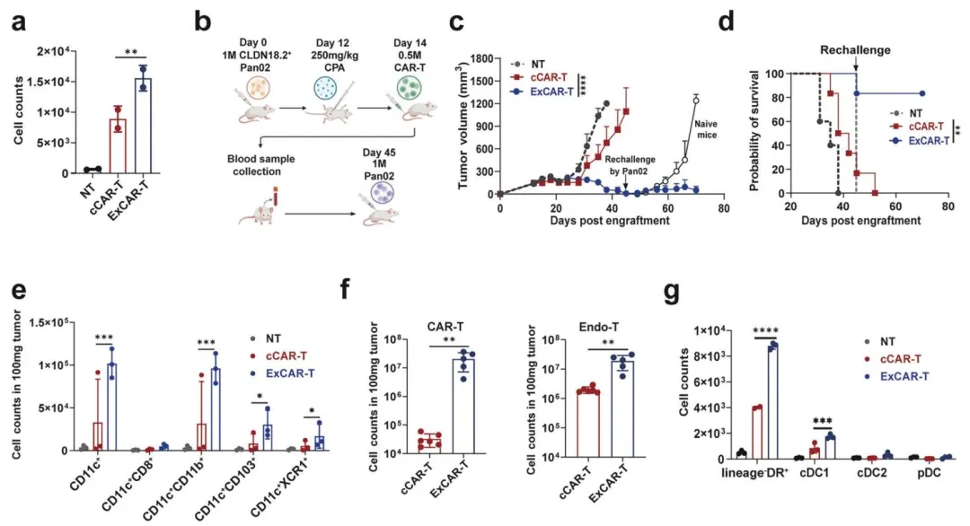 ExCAR‑T 通过 XCL1 趋化cDC1,激活内源 T 细胞,形成长期免疫监视;抗原阴性再挑战仍能控制肿瘤,实现免疫记忆。