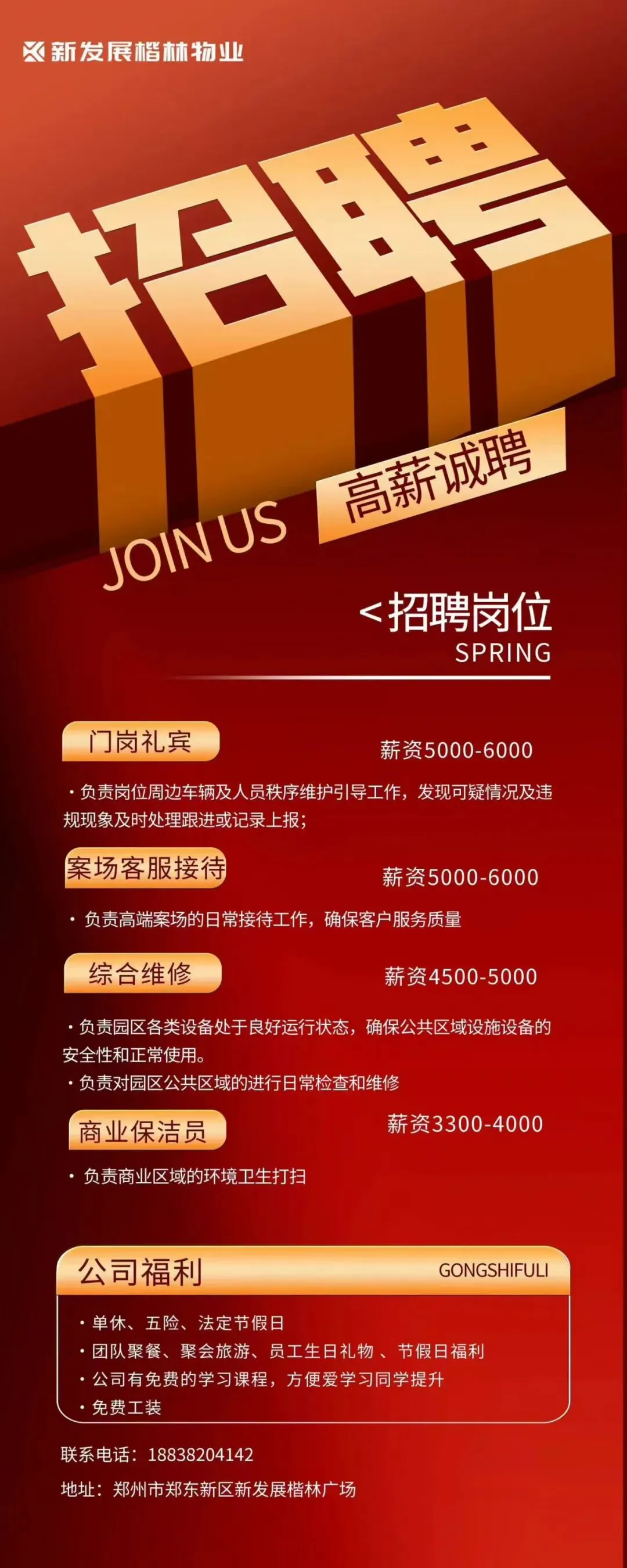 当前位置:首页>郑州>郑州新发展楷林物业高薪诚聘门岗礼宾、客服接待、综合维修及保洁员