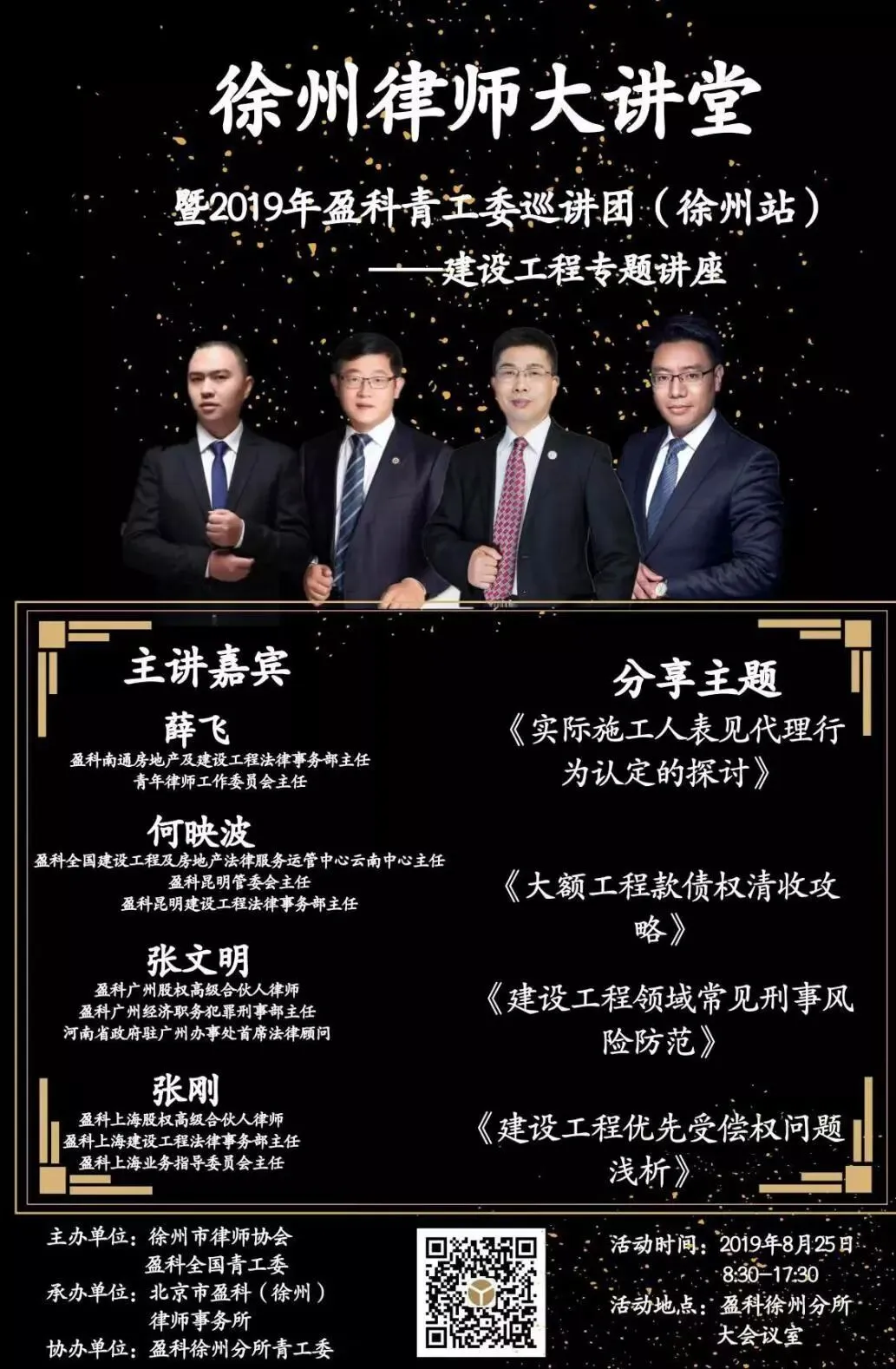 本次巡讲团的主讲嘉宾有盈科上海高级合伙人、建设工程法律事务部主任、业务指导委员会主任张刚律师,盈科广州高级合伙人、经济职务犯罪刑事部主任张文明律师,盈科全国建设工程及房地产法律服务运管中心云南中心主任、盈科昆明管委会主任、建设工程法律事务部主任何映波律师,盈科南通房地产及建设工程法律事务部主任、青年律师工作委员会主任薛飞律师。