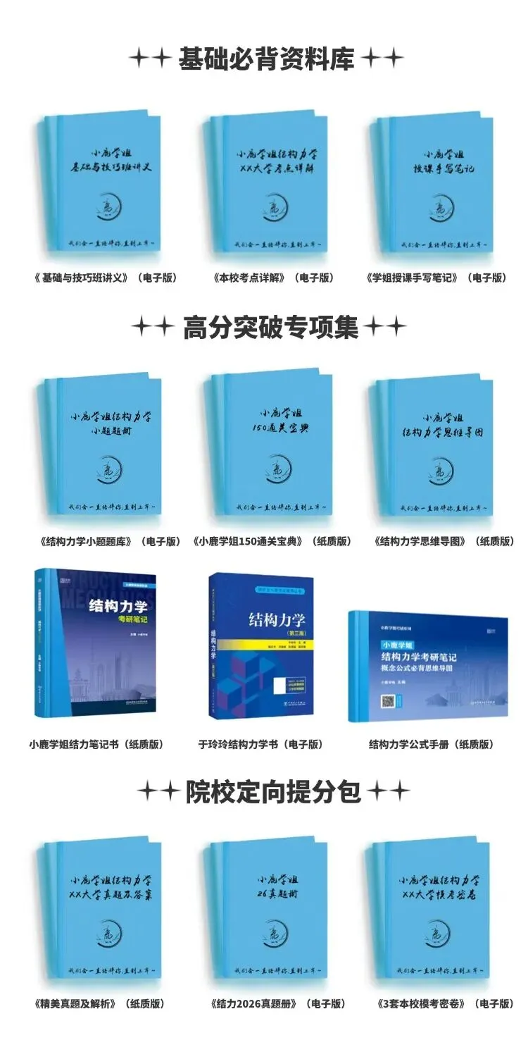 基础知识快速梳理、强化知识精讲、选择填空等小题总结及讲解、强化重难点串讲、小鹿学姐笔记书例题讲解、小鹿学姐结力150分通关宝典讲解。基础知识、重难点知识、例题讲解是用《小鹿学姐结构力学考研笔记》这本书来讲解的,这本书暑假班也会赠送。小鹿学姐结力150分通关宝典是按照考点进行汇编的,上面是各学校近几年的真题。