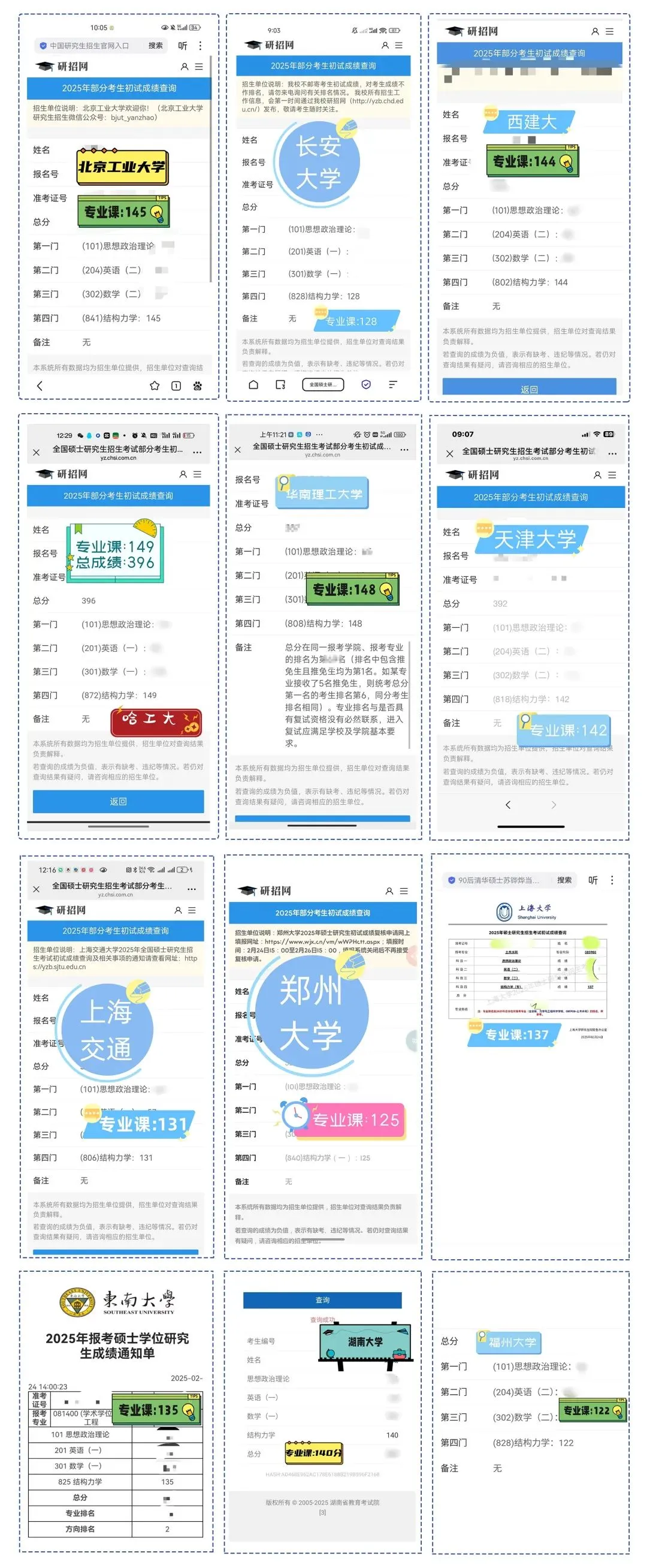 25年共有3086名同学报名了小鹿学姐的结构力学辅导班,其中718名同学结构力学拿到了130+的高分,608名同学结构力学拿到了120+的高分。湖南大学、哈尔滨工业大学、东南大学等多个学校的初试前五名都有我们的学员。下面是一些学员的成绩截图: