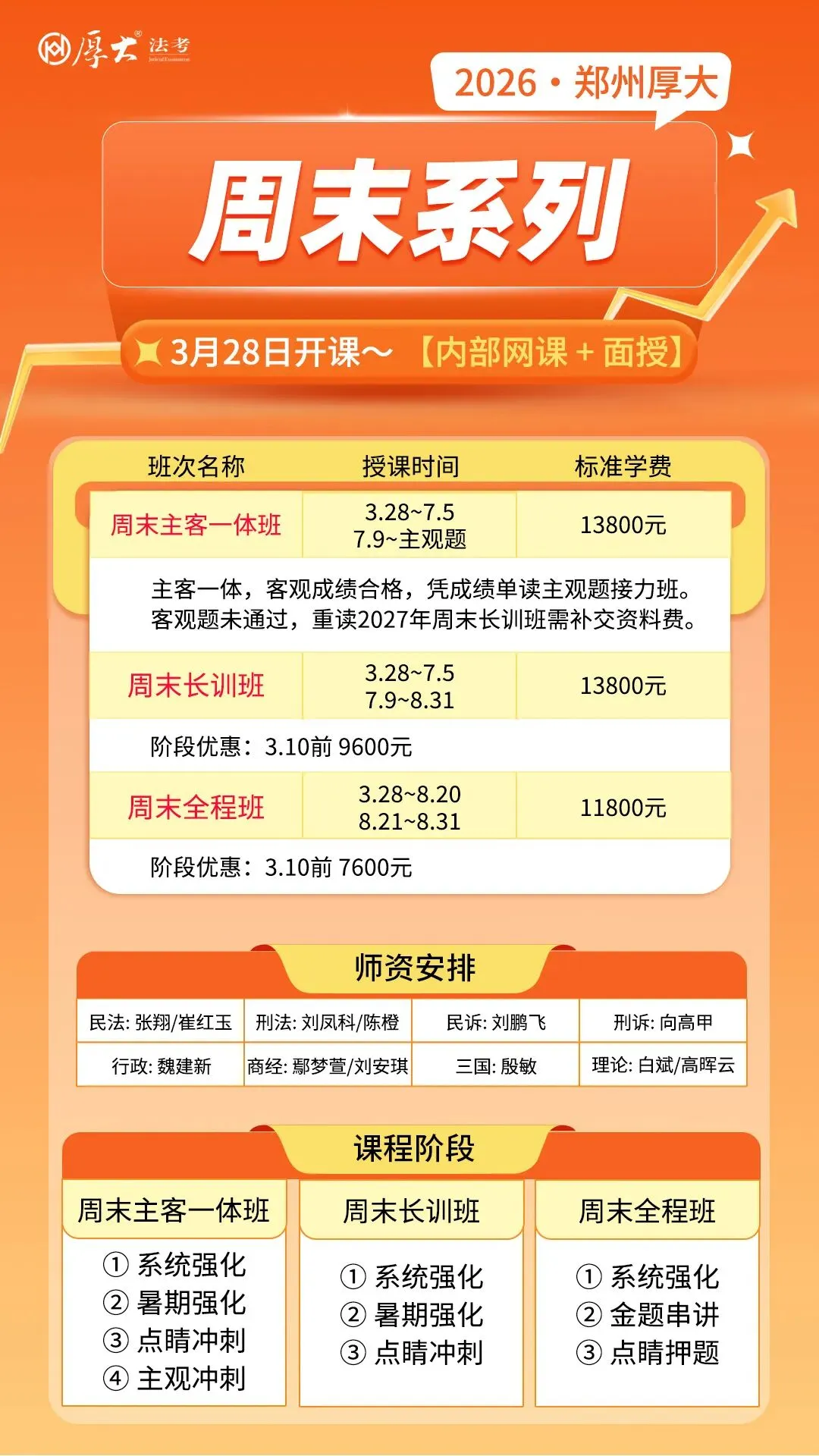 考虑到每位考生基础各异、备考目标有别,郑州厚大精心打造2026法考周末系列班,推出以下三种特色班型。无论你是何种类型的考生,这里总有一款能精准契合你的需求。