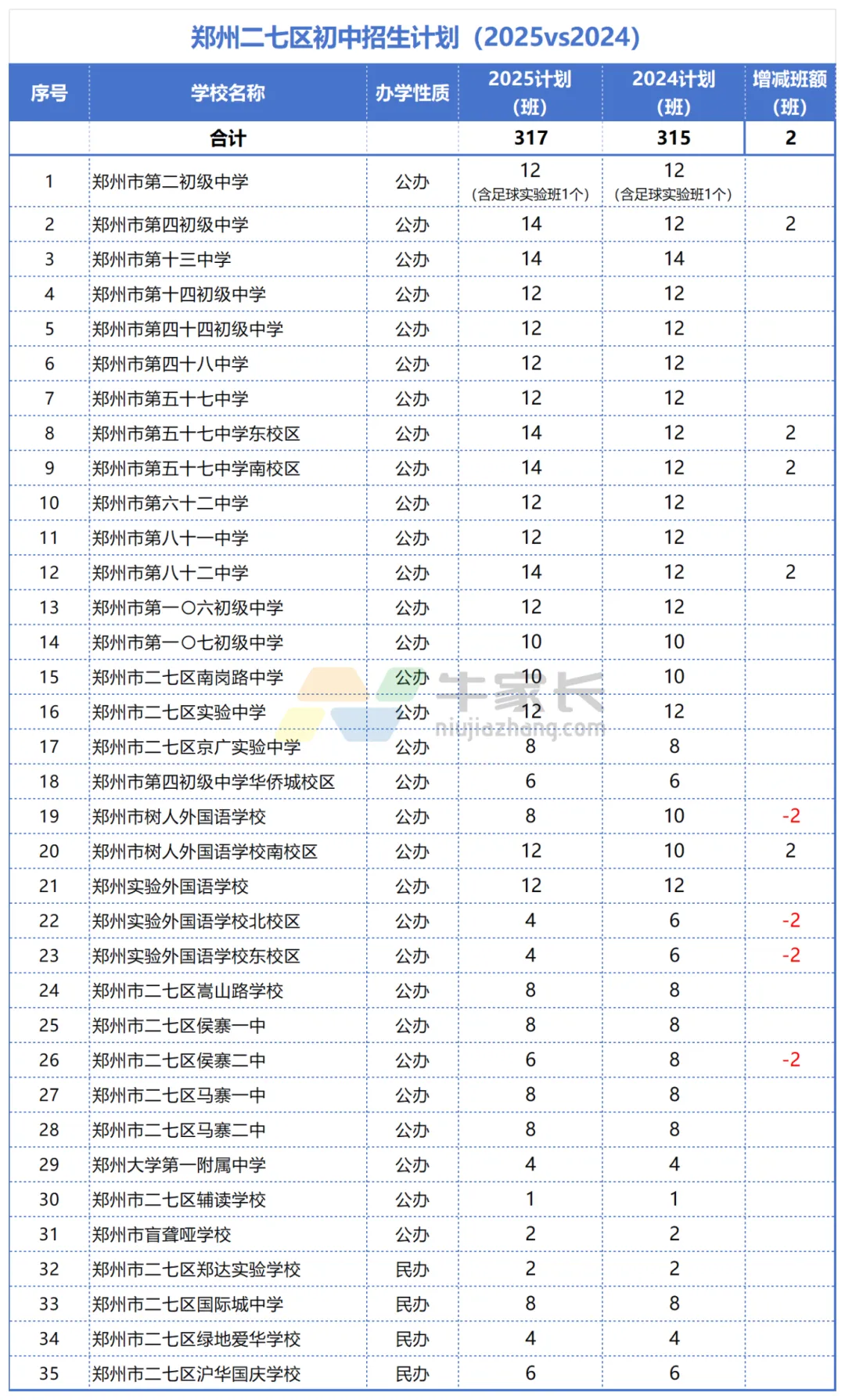 根据2025年招生计划,郑州二七区共有35所初中招生(含公办31所、民办4所),总计划招生317个班。2025年比2024年整体招生增加2个班。