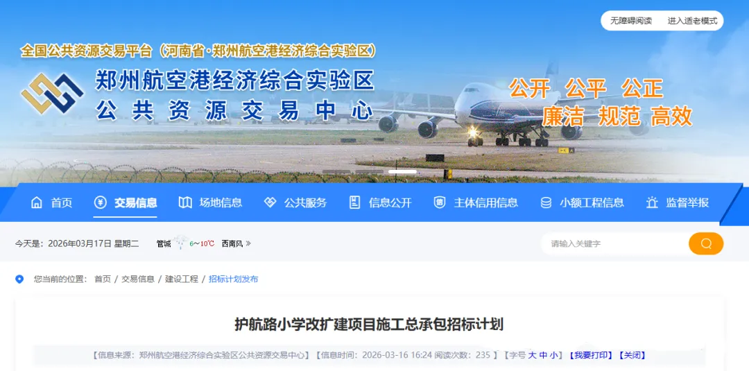 3月16日,航空港区公共资源交易中心发布《护航路小学扩建项目施工总承包招标计划》