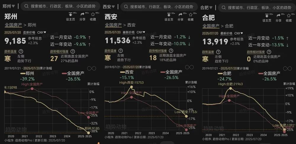 昨天晚上我把郑州的二手房数据从头到尾梳理了一遍,梳理完之后就失眠了,辗转反侧到夜里两三点。从2021年到现在,短短不到4年的时间,郑州的二手房价做了个俯冲的过山车。这个俯冲过山车把郑州的房价打到了一个极其亲民的价格。只要在河南十八个地市或者县城能买得起房,大概率也是够得着郑州。贝壳找房外网上能够看到的二手房大约13万套,我把这大约13万套的挂价总价区间做了个分类。这三个加起来,100万以下的挂价占比在56%。这还只是挂牌价,如果看成交价会更加往下。如果算成交价,郑州现在二手房成交总价中位数在83万。什么叫二手房价中位数,就是这个城市的房子按照成交总价从低到高排布,位于中间位置的那个数字。中位数,代表了这个城市中等的房价水平,或者说这个城市不贫不富普通刚需房产的房价。郑州的普通刚需标配,是90平左右的小三房,总价中位数83万,意味着单价在9200元/㎡。首付只需要13万,商贷月供2951元,公积金月供2802元。这个首付和贷款,基本上和地市买一套房的资金压力相差不大了。而且83万的90平小三房还是中位数。事实上比总价83万还低的90平小三房一抓一大把。五龙口桐柏路旁,2016年交房的升龙天汇3号院89平的小三房69万。金水区海洋馆附近双地铁的2017年次新小区九锦台,83平小三室只需要68万。曾经的管城红盘绿都紫荆华庭雅园89平的小三房只需要75万。首付10万块钱,月供2000出头可以在郑州还不错的位置买个10年房龄以内的次新小三房,什么概念!我是当年高位在郑州买房的人,看到这样的房价内心在滴血。那对于现在在郑州买房的人来说,确实巨大的红利。你可以骂这个城市其他的问题,但如果还骂郑州房价高就实实在在说不过去。郑州的二手房价不只是单看数据的低,就是拿到全国范围内,和任何一个省会去相比,都能凸显它的超高性价比。我找了几个周边或者和咱们相差不大的省会城市,做了一系列的数据对比。咱们常常拿来和郑州对比的西安和合肥,郑州房价和这两个城市已经相差一大截。郑州二手成交均价是9185元/㎡,西安的二手成交均价是11536元/㎡,比郑州均价高25%,合肥的二手均价13919元/㎡,比郑州高将近52%。不要说西安和合肥的工资水平比郑州高很多。衡量收入可以看城市的租金水平一个城市的租金中位数水平代表着这个城市普通白领的主流收入水平。郑州租金中位数是1800元/月,西安租金中位数比郑州高200元/月,而合肥租金中位数和郑州相同,也是1800元/月。按照租金水平推算,即使合肥和西安的收入水平可能比郑州略高,但是每个月高不了几百块钱。如果要比房价,郑州的二手房价已经可以和石家庄和太原相比了。石家庄和太原如果和郑州比经济实力、比收入和租金都是有所差距的。郑州2024年GDP是1.45万亿,太原GDP是0.54万亿,石家庄GDP是0.82万亿。如果只看经济体量1个郑州基本上快抵了3个太原,2个石家庄。而租金中位数上,太原的租金中位数是1600元/月,石家庄的租金中位数是1500元/月,都没有郑州的租金水平高。租金背后隐含着收入水平,这意味着两个城市的收入水平不如郑州。太原二手房成交均价9690元/㎡,石家庄二手房成交均价是9445元/㎡,都比郑州二手房价高。如果把全国省会城市二手房价做成一个立体图,房价高的展示的坡度高,房价低的展示的坡度低。那这个图一眼瞅过去,在中部省份里面,郑州的二手房价展示绝对是个大大的洼地。如果按照历史房价回溯,郑州整体二手房价大致回到了2015-2016年间,也就是十年前。而在这10年房价轮回里,看似价格又回到了原点,但是在这原点背后,是郑州房价逻辑发生了翻天覆地的大变化。十年前9000出头的二手整体均价之下,郑州的豪宅价格也就是在2万-3万之间。2016年北龙湖建业海马九如府开盘,均价是2.2万/㎡。当时郑州老破小即使很便宜,价格也能在5000元/㎡以上。而现在的9000出头的均价之下,有7-8万/㎡的北龙湖豪宅,也有单价即将跌破2000元/㎡的中原区三环内老破小。同一个郑州,相比较十年前,房价的参差极大。第二点变化,产品正在超越地段,成为房价的决定性因素。这个不只是出现在新房第四代住宅和二手较大的价差上,在二手市场上,二流地段的好产品的房价,卖的比一流地段一般产品的价格都要贵。比如金水北的部分高得房率的二手房,价格超越了东区高铁站板块。产品盖过地段决定房价的共识,到现在都无法判断是一时潮流还是不可逆的趋势。如果是一时潮流,就存在郑州不同板块的房价高估和低估。如果是不可逆的趋势,郑州的房价板块可能还在变化。这个验证就交给时间。那基于郑州二手房市场正在发生的变化,给各位买二手房的朋友一些建议吧。经过房价调整,郑州不同区域之间的价格差越来越小了,中原区有8000多的二手房,东区有9000多的二手房,价差不大产品差异不大的情况下,选更好的区域。在郑州普通人最保值的房产还是带有学区属性的。在学区面前,什么地铁、山河湖统统都不顶用。而学区房的选择上,能双学区更好,不能的话初中学区优于小学学区。要选更好的产品,但是不要过分迷恋好产品,尤其是需要支付过高溢价的情况下,要慎重选择。尽量选10年以内的次新,现在10年以内的次新价格和10年以上的价差并不太大。尽量选物业好的小区,尤其是到未来城市更新的历史阶段,小区维护的重要性会大大加强。房地产行业大的