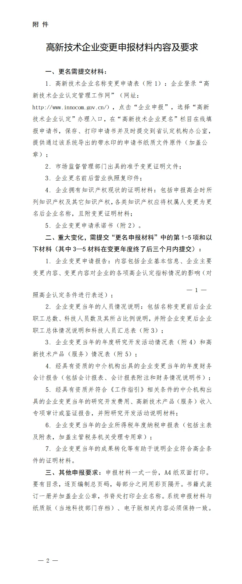 根据河南省科技厅《关于组织2026年度高新技术企业更名和重大变化工作的通知》(豫高企办〔2026〕5号)要求,现组织开展2026年度郑州市高新技术企业更名和重大变化材料报送工作。有关事宜通知如下:1、企业更名,即企业仅发生名称变更,不涉及与认定条件有关的重大变化(如分立、合并、重组以及经营业务发生变化等)。2、企业重大变化,即企业发生与认定条件有关的重大变化(如分立、合并、重组以及经营业务发生变化等,无论名称变更与否)。本年度高新技术企业更名和重大变化工作采取常年受理、定期报送的方式,省科技厅拟定于4月、7月、10月集中组织三次审核。郑州市科技局拟分三批审核报送省科技厅。申报材料受理时间安排如下:1、企业申请。高企发生名称变更或者重大变化后,应在发生之日起3个月内向当地科技部门报告,并提交网上变更申请材料(详见附件1)。登录“高新技术企业认定管理工作网”(网址:http://www.innocom.gov.cn/),点击“企业申报”,选择“高新技术企业认定”办理入口,在“高新技术企业更名”栏目在线填报申请书,提交到“河南省认定机构办公室”账号下,完成网上更名操作。2、材料报送。申报材料一式一份,A4纸正反双面打印。要有目录,逐页编制总页码,每部分之间用彩页隔开。书籍式装订成册并加盖企业公章,书脊处打印企业名称。系统申报材料与纸质版、电子版相关内容必须保持一致。所有申报材料扫描后电子版拷贝至U盘,报送至郑州市科技局8楼805室,《高新技术企业名称变更情况汇总表》(见附件--附6)电子文档发送到工作邮箱(zzkjjgxc@163.com)。 按照省高企更名工作部署,航空港区、高新区科技主管部门负责本地区高新技术企业变更工作,相关变更材料直接报送省科技厅。材料报送地址:工人路13号郑州市科技局8楼805 室联系电话:0371-67174529 0371- 67180916政策咨询: 400 118 2005、136 1120 4568政策咨询 >遍布全国31个省市的补贴政策,一键触达。知识产权 > 商标、版权、专利,我们的见解自己都震惊。税务筹划 >访遍全国洼地为您筹谋,合理节约每一分钱。