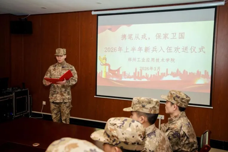 春风送暖,战鼓催征。近日,郑州工业应用技术学院2026年春季大学生入伍欢送仪式举行。学校学生处、武装部负责人,各学院党委书记、分团委书记参加仪式。