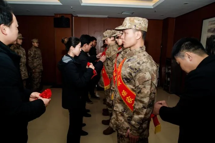 仪式现场,全体入伍学子面向五星红旗庄严宣誓;与会领导为新兵们逐一佩戴“光荣入伍”红花与绶带,赠送纪念礼品,以满满的仪式,致敬每一位热血青年。