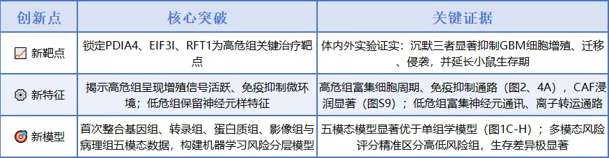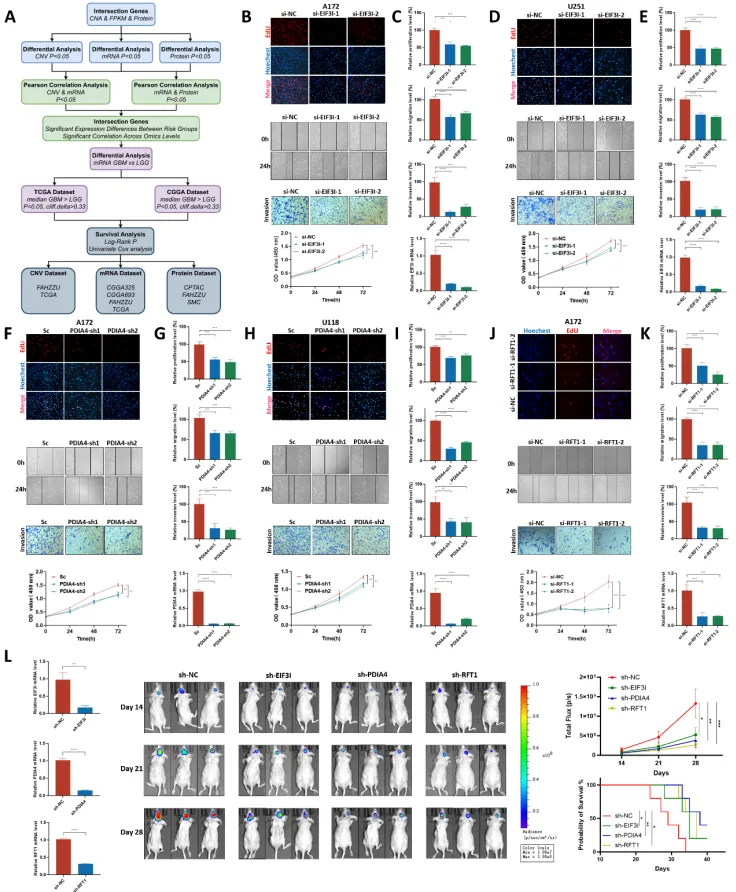 通过多组学层层筛选,研究团队锁定PDIA4、EIF3I和RFT1三个在高风险组中异常活跃的基因。体外实验证实,沉默这三个基因能显著抑制胶质母细胞瘤细胞的增殖、迁移和侵袭能力。