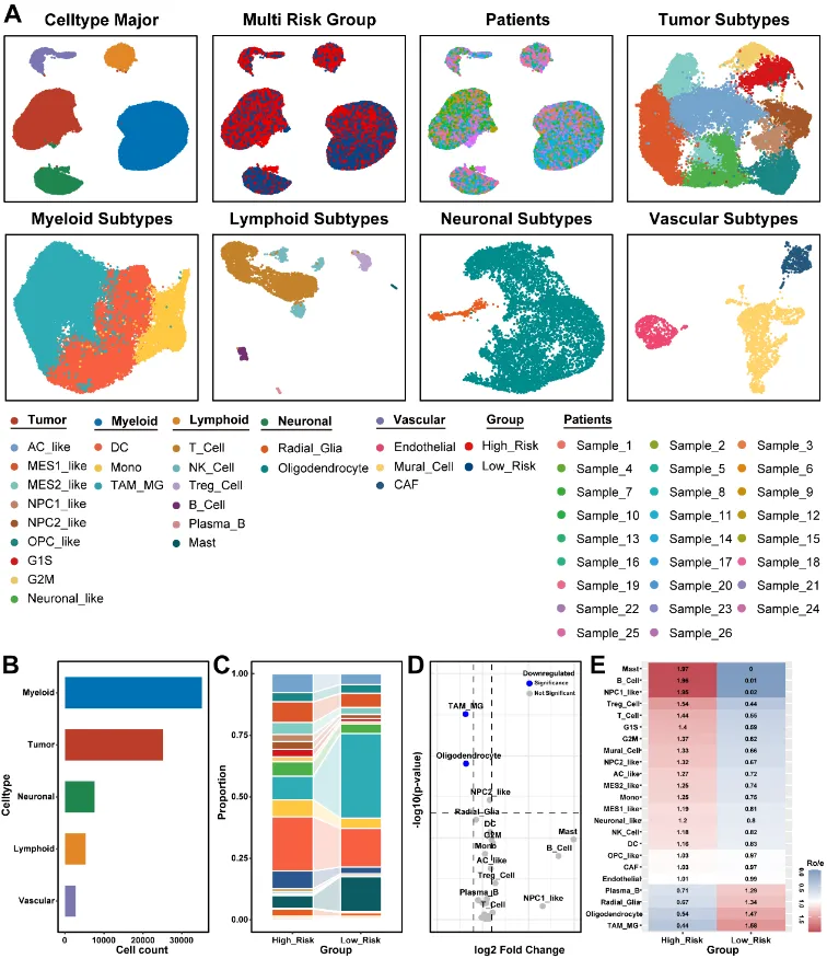 通过对26例患者的单细胞转录组数据进行聚类分析,研究识别出23种细胞亚群。结果显示,低风险组患者中少突胶质细胞样细胞和TAM-MG(微胶质样巨噬细胞) 显著富集,提示这些细胞可能与较好的预后相关。
