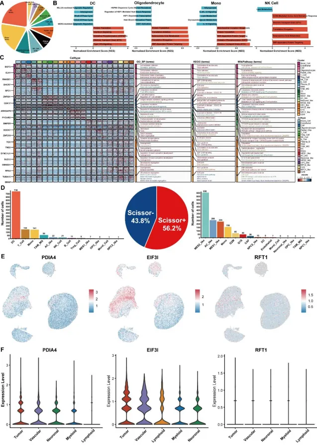 通过Scissor算法整合单细胞与生存数据,研究发现与不良预后相关的细胞(Scissor+)主要为AC样、MES样、G2M样恶性细胞;而与良好预后相关的细胞(Scissor-)则多为DC和T细胞。