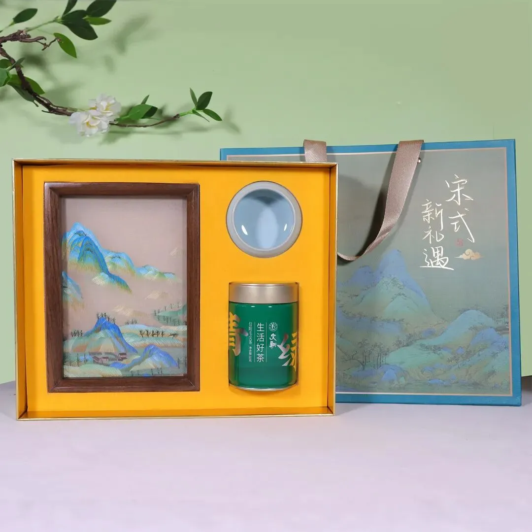 礼盒整体设计简约雅致,内含河南多项非遗瑰宝,既有代表宋画巅峰的汴绣作品千里江山双面绣摆件,又搭配汝瓷杯、信阳毛尖茶等中原好物。它寓意着前程锦绣、诸事圆满、雅致安康,不仅是一份礼物,更是一张河南文化名片,让收礼人感受到中原大地的厚重底蕴与满满诚意。