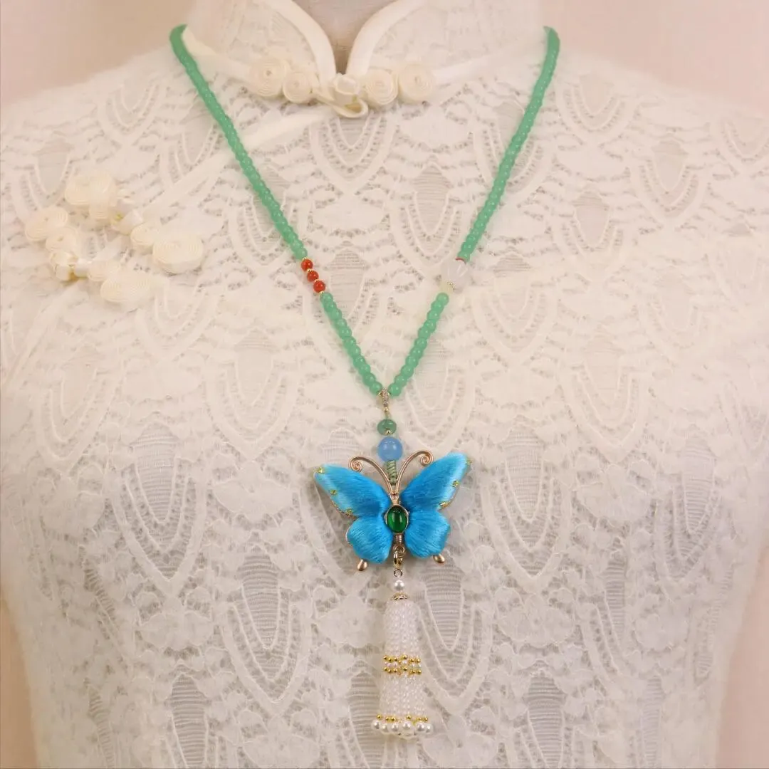 想要实用与颜值兼具,送女性亲友首选这款手工刺绣毛衣项链,它打破了传统刺绣的局限,将河南非遗汴绣融入日常穿搭,尽显温柔别致的东方美学。项链主体由温润东陵珠串联而成,质感清透高级;核心吊坠为纯手工汴绣蝴蝶造型,绣工细密,搭配流苏珠串更显灵动。