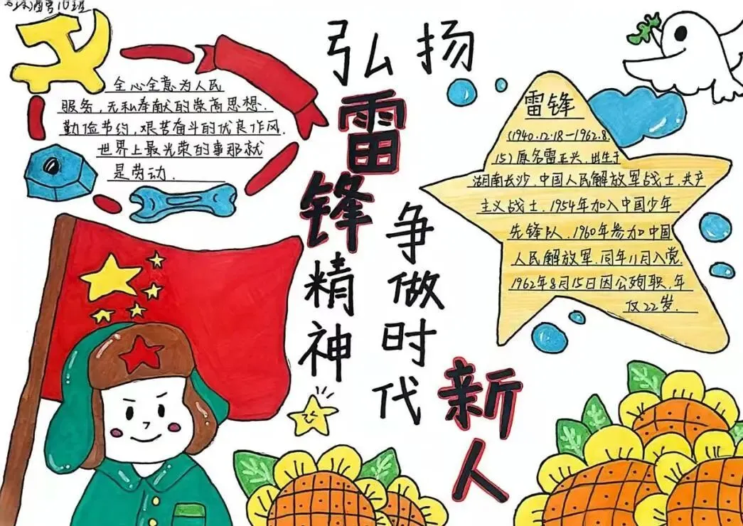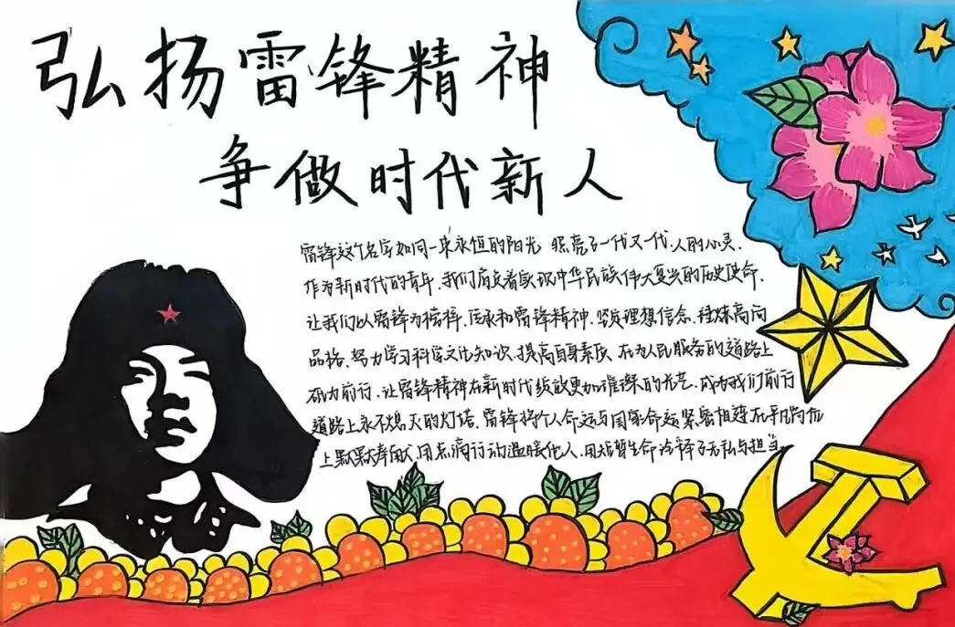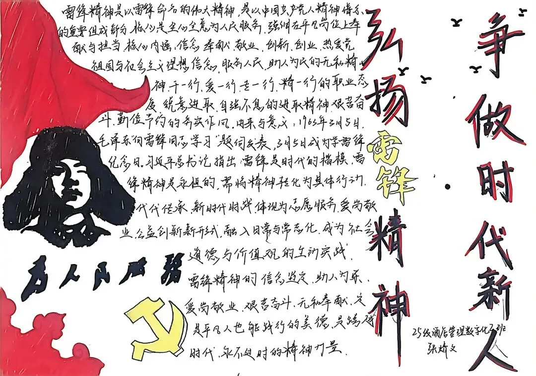 本次活动以手抄报为载体,让雷锋精神从课本走向实践,引导同学们深刻理解“奉献、友爱、互助、进步”的志愿精神内涵,将思想教育与动手创作有机结合,真正做到知行合一。创作中,同学们心怀敬意、精心排版,以图文形式生动展现雷锋精神,在实践中增强社会责任感与奉献意识,树立正确价值观,明确新时代青年的责任与方向。活动进一步营造了团结互助、向上向善的良好氛围,传递了青春正能量。