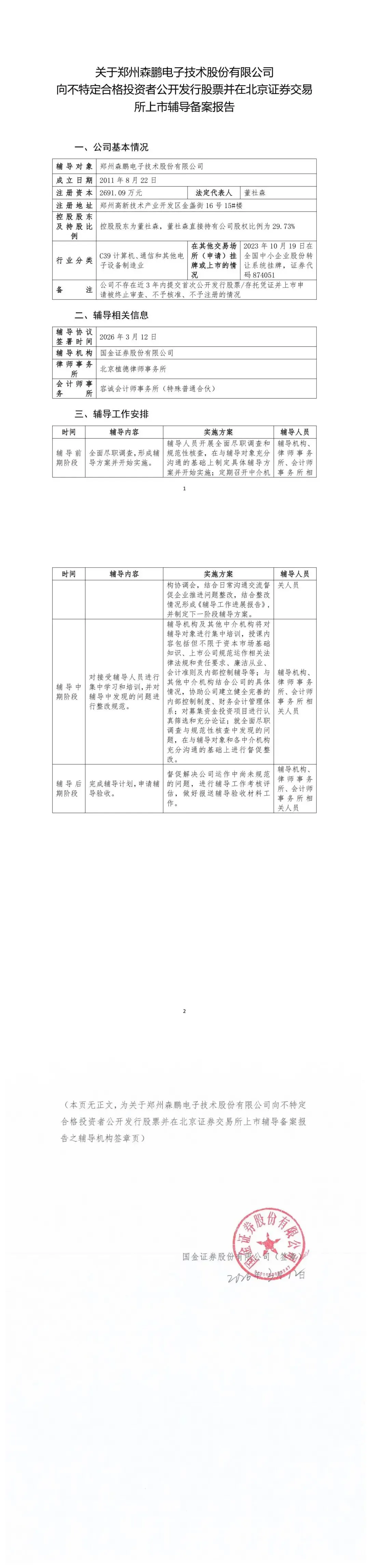 2026年3月18日,证监会官网显示,国金证券已提交《关于郑州森鹏电子技术股份有限公司向不特定合格投资者公开发行股票并在北京证券交易所上市辅导备案报告》。辅导机构为国金证券股份有限公司,律师事务所为北京植德律师事务所,会计师事务所为容诚会计师事务所(特殊普通合伙)。郑州森鹏电子技术股份有限公司,公司位于河南省郑州市,致力于成为全球领先的车辆数智化解决方案提供商,是国内领先的商用车电控系统和信息系统软硬一体解决方案提供商。法定代表人董社森。森鹏电子的控股股东及持股比例情况如下:控股股东为董社森,董社森直接持有公司股权比例为29.73%。天眼查信息显示,森鹏电子历史上仅获得了河南高创的投资。