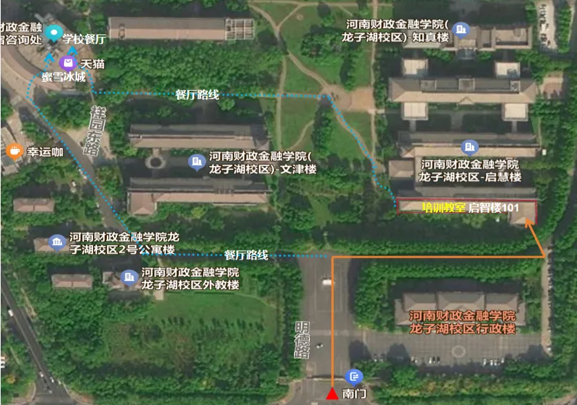 (二)的士/网约车:在河南财政金融学院南门下车。(三)公交车:114、160、166路可达河南财政金融学院站,站台对面就是学校南门。(四)培训场馆指示图:校园内培训场馆及学校餐厅指示图(一)考核标准: