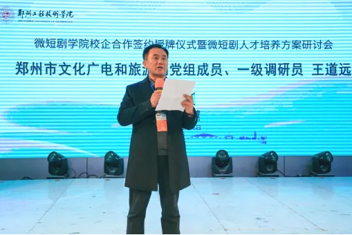 王道远在致辞中表示,郑州坐拥黄河文化、红色文化、少林文化、商都文化等丰厚文旅资源,为微短剧创作提供了不竭素材,微短剧更是讲好郑州故事、推动文旅与影视深度融合的优质载体。当前郑州微短剧产业正处于政策赋能、资源集聚的黄金发展期。郑州市文广旅局将持续发挥桥梁纽带作用,整合文旅资源、产业政策等优质要素,从资源对接、项目支持、成果推广等方面,为微短剧学院建设发展、校企深度合作提供全方位保障。他高度肯定郑州工程技术学院率先成立全国首个微短剧学院的前瞻布局,认为此举为郑州微短剧产业发展储备了宝贵人才,树立了高校服务地方产业发展的标杆。