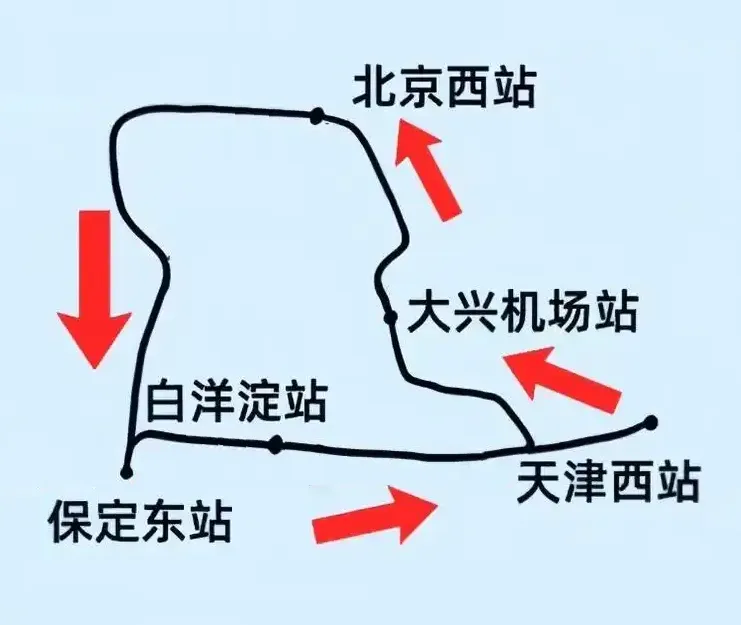 2026年2月,京津冀地区迎来了一条环线高铁,G8859/64次列车从北京西站始发,经保定东、白洋淀、天津西、大兴机场站终到北京西站。G8863/61次列车从北京西站始发,经大兴机场、天津西、白洋淀、保定东返回北京西站。