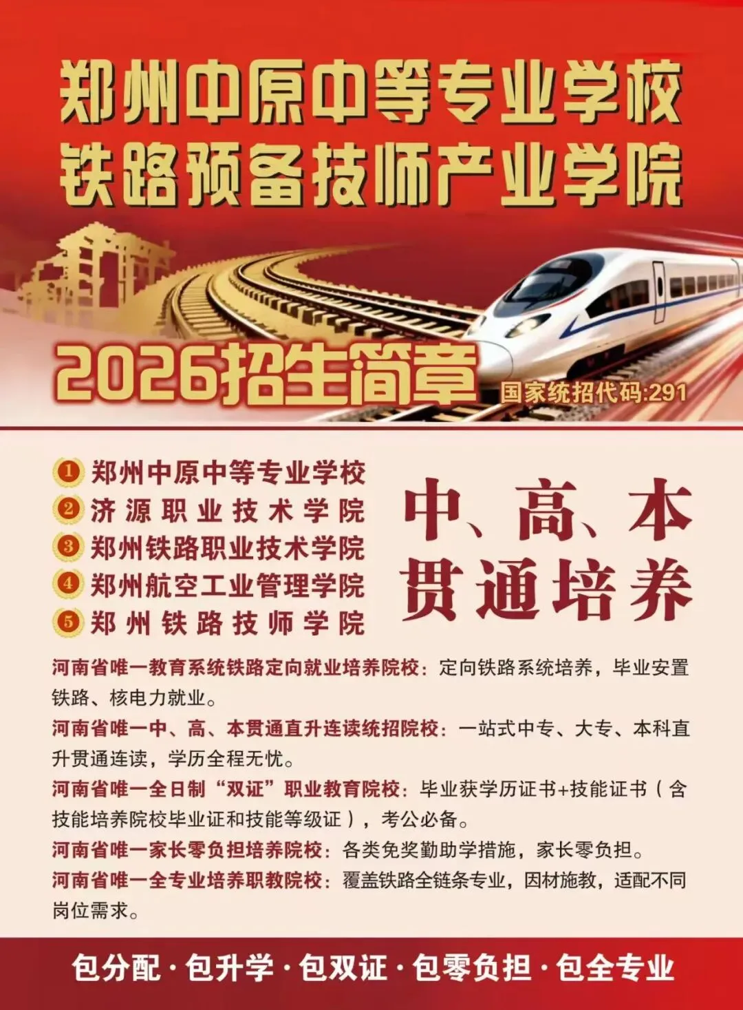 【专注铁路职教,零学费入学,确保铁路就业】2026年郑州中原中等专业学校