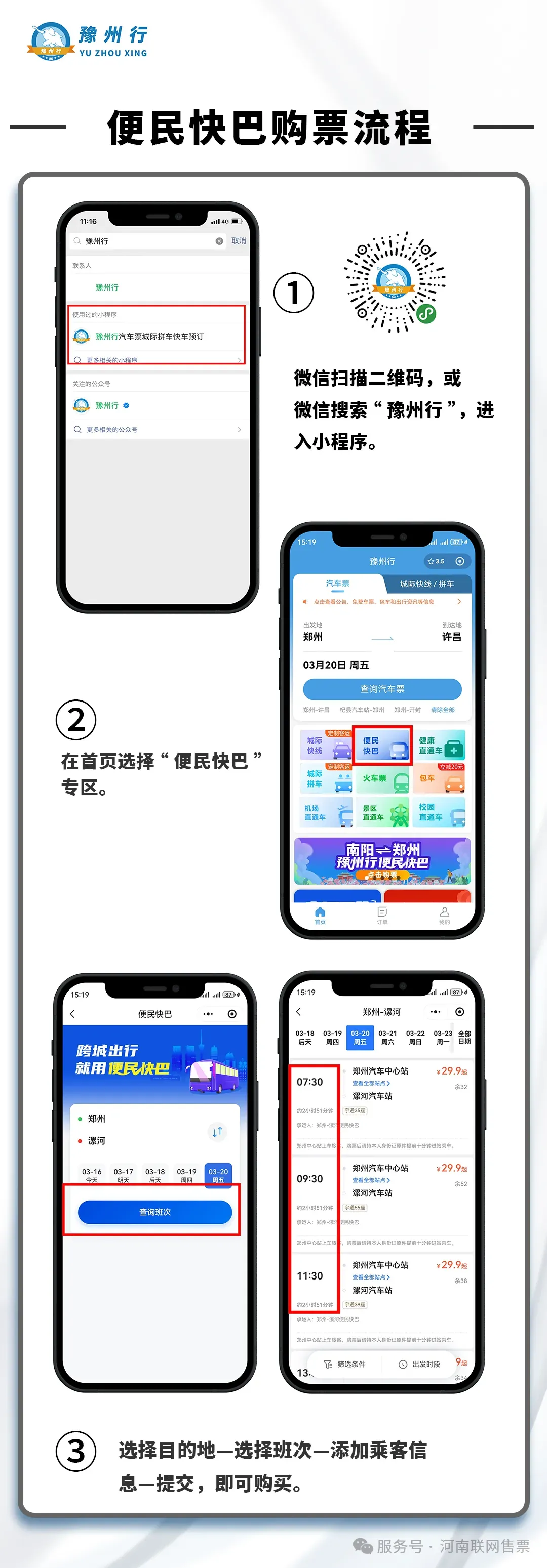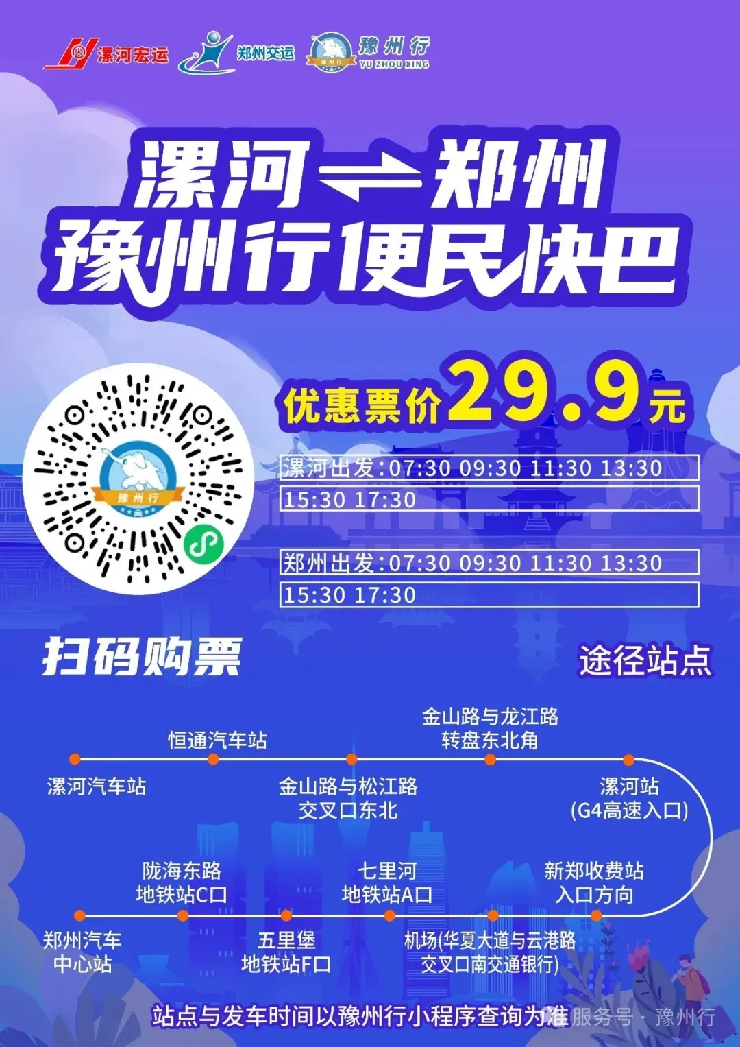 重点记牢!3月20日,郑州⇌漯河豫州行便民快巴正式开通,当天起按固定班次双向对发,当天就能购票乘车,彻底解决郑漯两地往返不便的痛点。