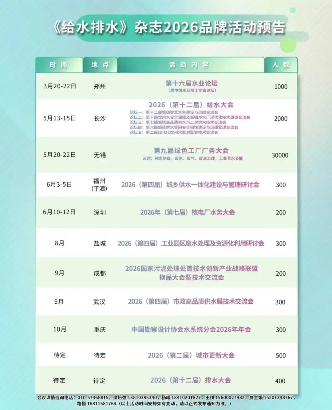 “第十六届水业论坛”(原中国水业院士专家论坛)将于2026年3月20-22日(20日全天报到)在河南省郑州市召开。本届论坛以“场景创新·数智赋能—— ‘十五五’水务行业高质量发展”为主题,汇聚政府部门、水务企业、科研智库及金融机构的智慧与力量,共同解读“十五五”城镇水务政策方向,洞察AI等前沿技术与水务业务融合的最新趋势,展示和研讨智慧水务在各类典型场景下的创新应用与成功实践,推动构建技术驱动、场景落地、价值共创的水务发展新格局。我们诚挚地邀请您出席会议。