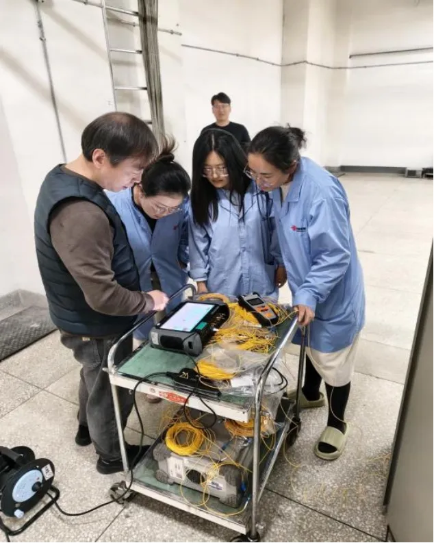 布线测试: 一根根尾纤在他们的巧手下精准布放,每一次测试都是为了信号的完美无损。