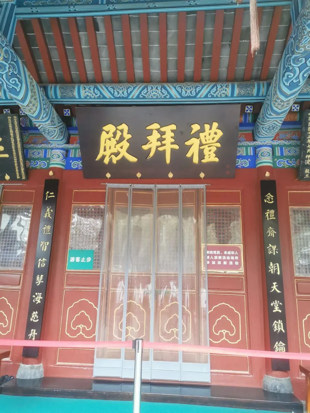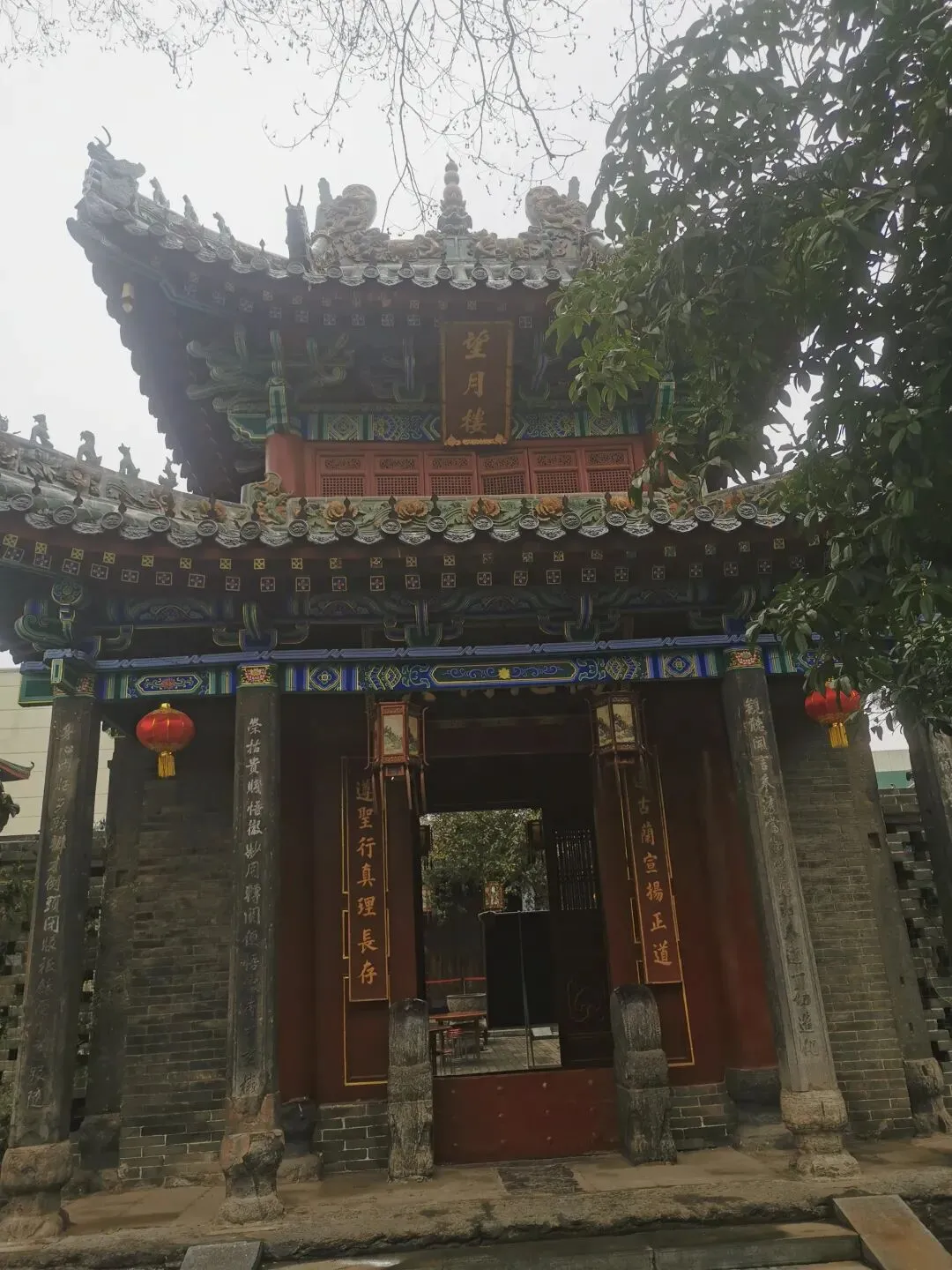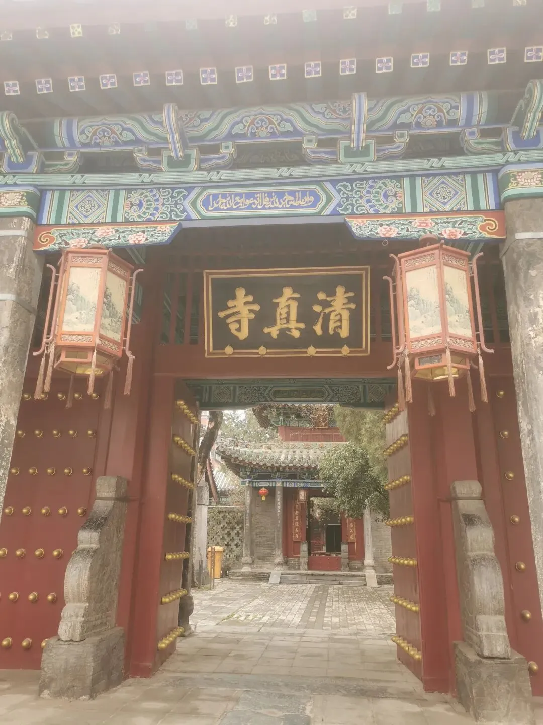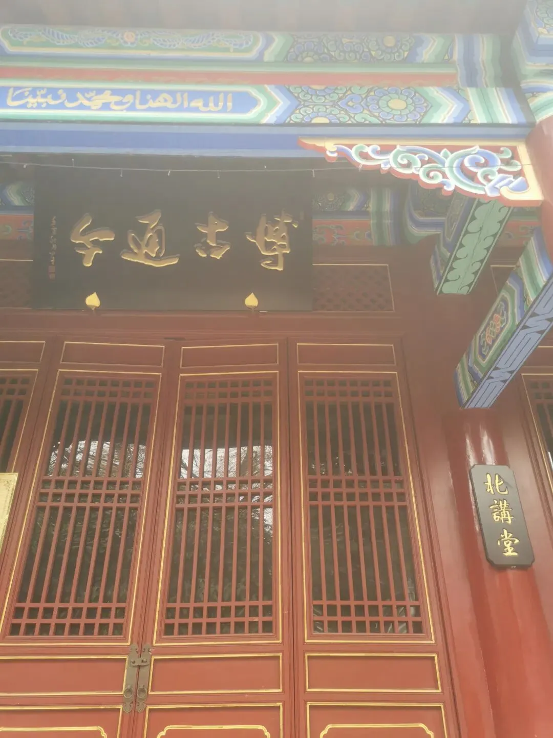 看这个门匾门洞,你可能已猜到,这个古建筑群与伊斯兰穆斯林清真寺有关。出发前,在高德地图目的地上输入这个清真寺名字的时候,还有所担心,别像以往有时候导航坐公交,倒几回车去了,结果让人失望,看了个“寂寞”。看到这个门匾、门洞和里面的建筑,我不由惊喜,看来不枉此行。门洞两侧,右边是一典型伊斯兰装饰侧门。门两边嵌有对联:乾坤广大惟一主,教道虽多无二真。左边侧门,古朴厚重。嵌联:要识得珠须返岸,若思边海早修船。2013年4月,被中华人民共和国国务院公布为“全国重点文物保护单位”。郑州清真寺因地处北大街,故又名北大街清真寺、北大清真寺或北大寺,是伊斯兰教在郑州建造最早、规模最大的清真寺。始建于元末明初。郑州北大清真寺有明代宣德炉两只,为稀世之物。本寺是全国重点文物保护单位,郑州旅游胜地,前来该寺观光礼拜的人数甚多。郑州北大清真寺是伊斯兰教的一种象征。郑州北大清真寺,位于郑州市管城区北大街128号。寺院占地近17亩,主要建筑包括望月楼、大殿等,采用中国传统宫殿式建筑风格。望月楼小巧玲珑,是寺中特有建筑,用于观月斋戒。寺内还存有清代碑刻16通。1953年和1982年,郑州市政府两次拨款翻修。