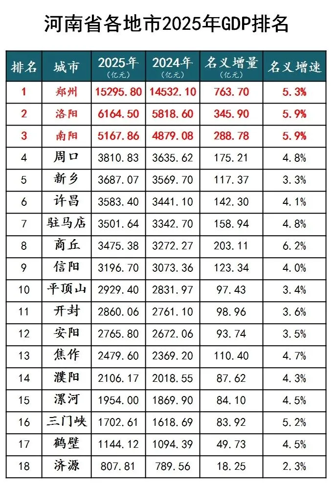 从三地市经济总量看,郑州、洛阳、南阳以15295.8亿、6164.5亿、5167.86亿入围2025年中国GDP百强城市榜单,分别位居16、51、64名。