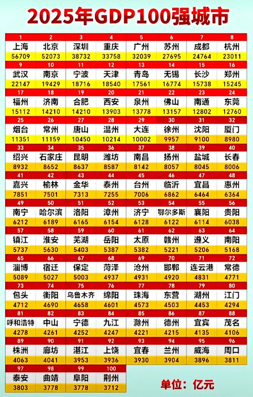 ▲2025年GDP百强城市排名(河南省有郑州、洛阳、南阳、周口四城入围)。图源:数据狂人张。