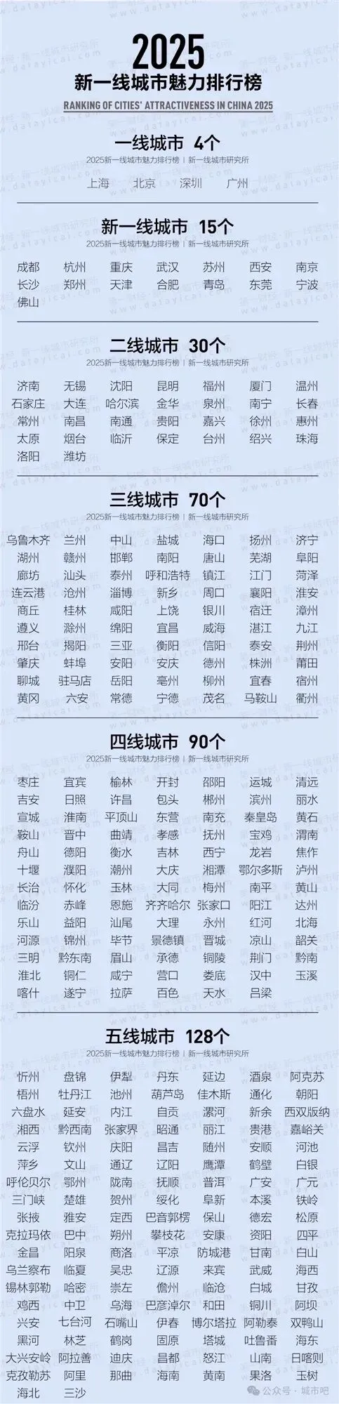 ▲2025年城市分级完整名单。图源:新一线城市研究所。