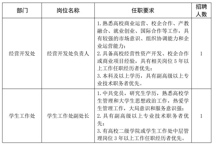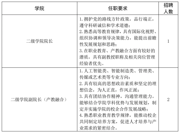本次招聘涵盖高层次人才、二级学院院长 / 副院长、行政管理等岗位,各岗位具体要求如下: