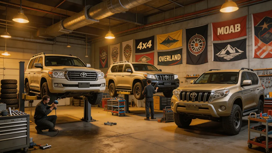 门店不大,装修也不讲究,但墙上挂满各地越野旗帜,店里永远停着霸道、陆巡,引擎声没停过。店里的技师都有中高级技术职称,老朱挂在嘴边的话是"卓越团队,冠军品质"——这话听着有点官方,但他确实是这么要求的。
