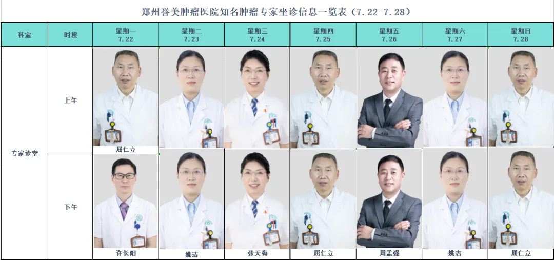 郑州誉美肿瘤医院肿瘤专家坐诊排班表(7月22日-7月28日)