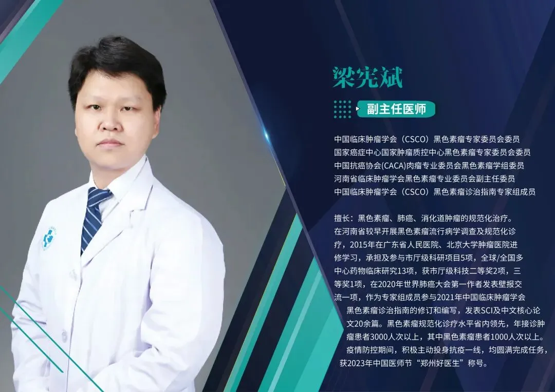 中国临床肿瘤学会(CSCO)黑色素瘤专家委员会委员、国家癌症中心国家肿瘤质控中心黑色素瘤专家委员会委员、中国抗癌协会(CACA)肉瘤专业委员会黑色素瘤学组委员