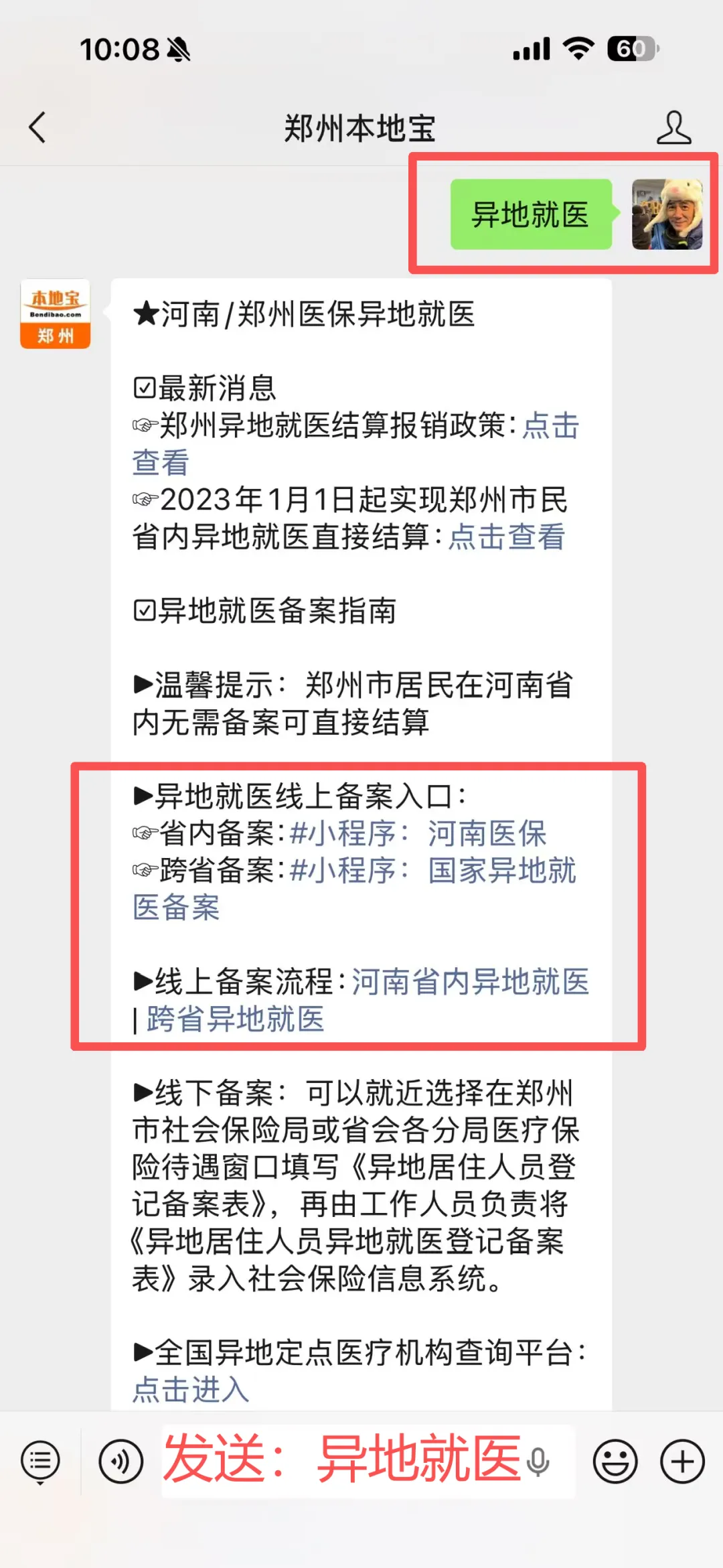 在聊天对话框回复【异地就医】
