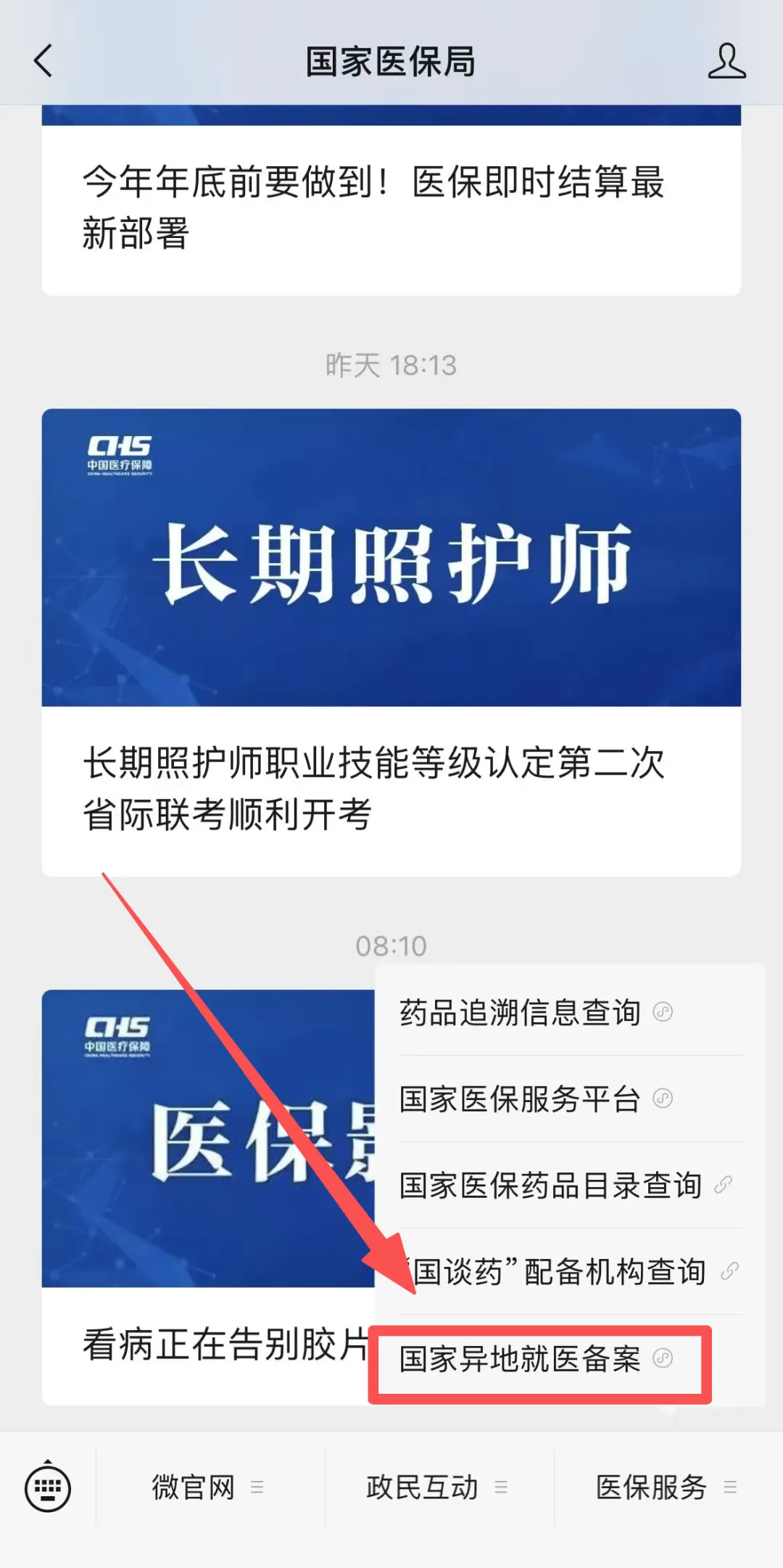 进入“国家医保局”微信公众号,点击医保服务→国家异地就医备案,进入异地备案小程序页面点击“异地就医备案申请”