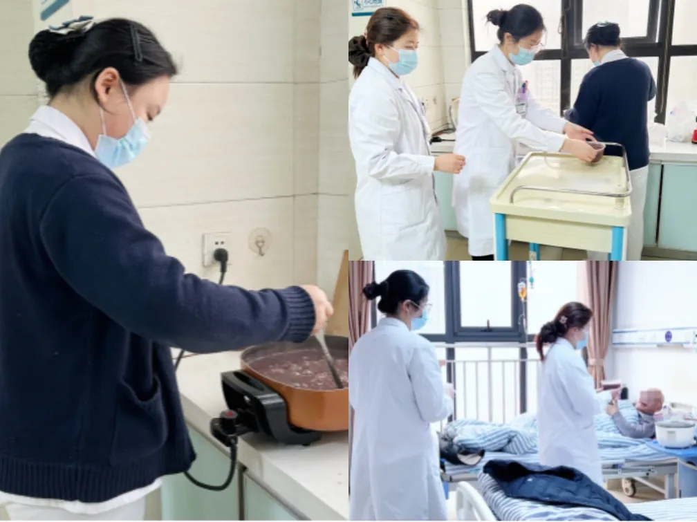 肿瘤六科的医护人员亲手熬制腊八粥,送至床旁并送上真诚祝愿,愿以微薄暖意护患者身心安康,让这个腊八节因这份关怀而格外暖心。