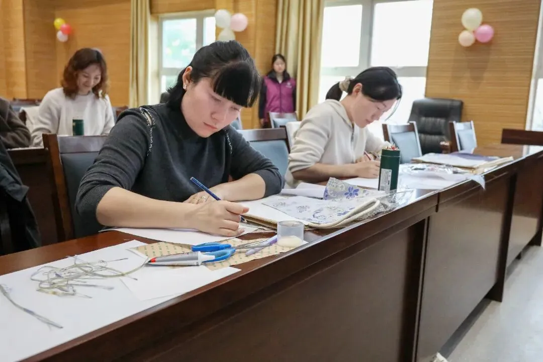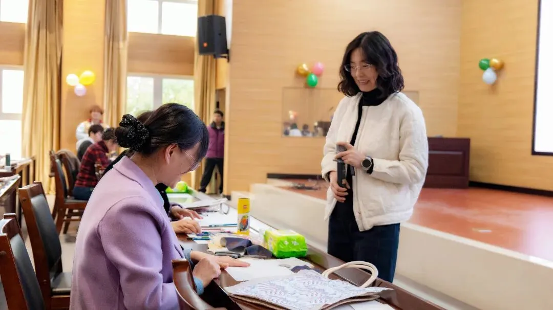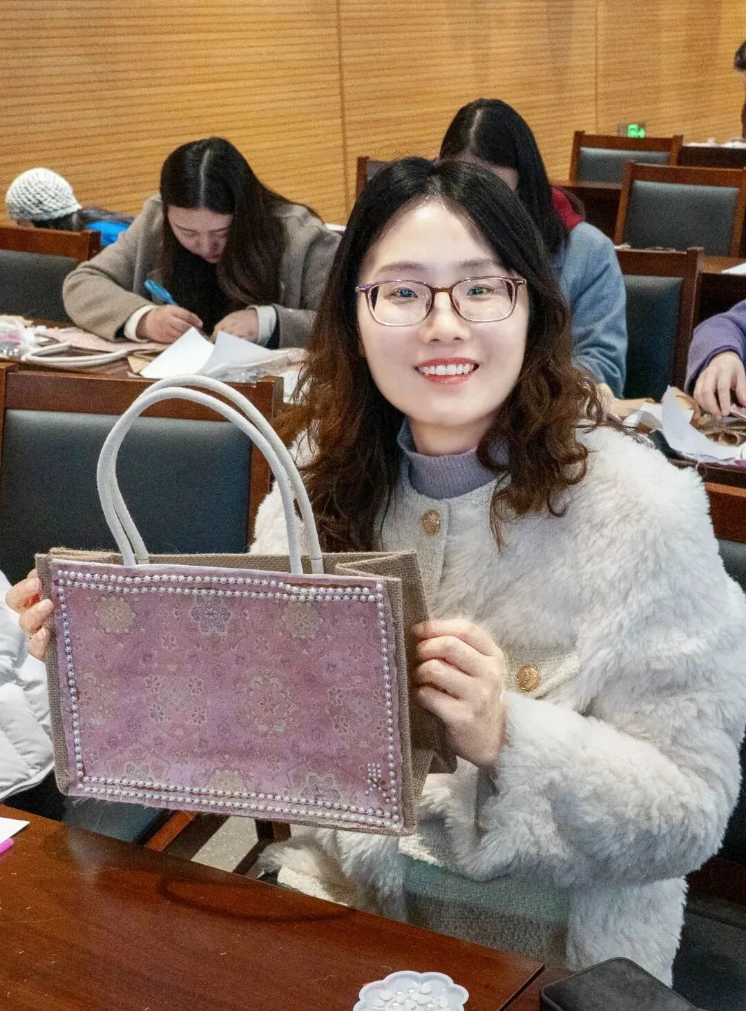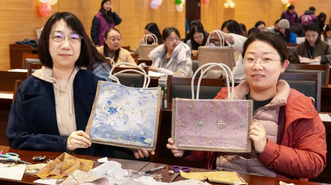 结合路老师绘画心理讲解,在融合了非遗文化的“锦承心意”环节,女职工们亲手制作宋锦DIY手提袋,在针线与织物的交织中,沉浸式感受传统文化的温度与美感。
