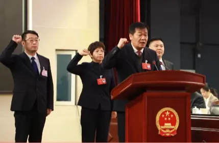 新当选的县人大常委会主任李云峰、副主任贺学勤(女)、委员田雨、雍超进行宪法宣誓。