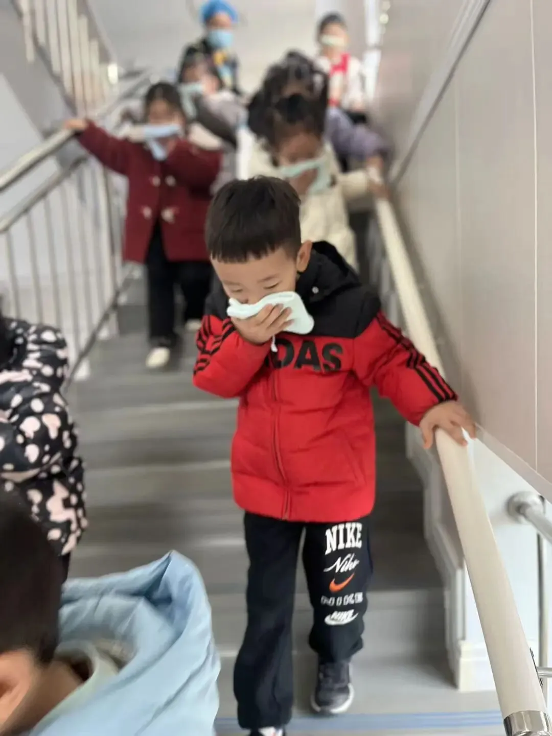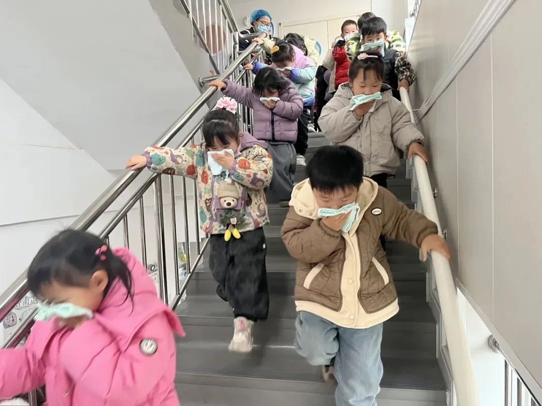 随着急促的消防警报声骤然响起,消防演练正式开始!各班教师立即按照预定方案,迅速组织幼儿用湿毛巾捂住口鼻、弯腰低头,沿着安全通道快速、有序地向户外安全区域撤离。整个撤离过程中,孩子们听从指挥、不推不挤,教师们全程守护在幼儿身旁,时刻关注孩子的撤离情况,短短几分钟内,全体师幼安全抵达指定集合点,清点人数后及时向演练负责人左主任汇报,整个演练过程规范、高效,达到了预期效果。