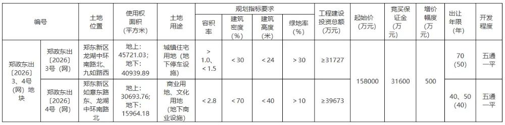 3月19日,郑州市公共资源交易中心发布公告,郑政东出〔2026〕3、4号(网)地块正式挂牌出让,总起始价15.8亿元。