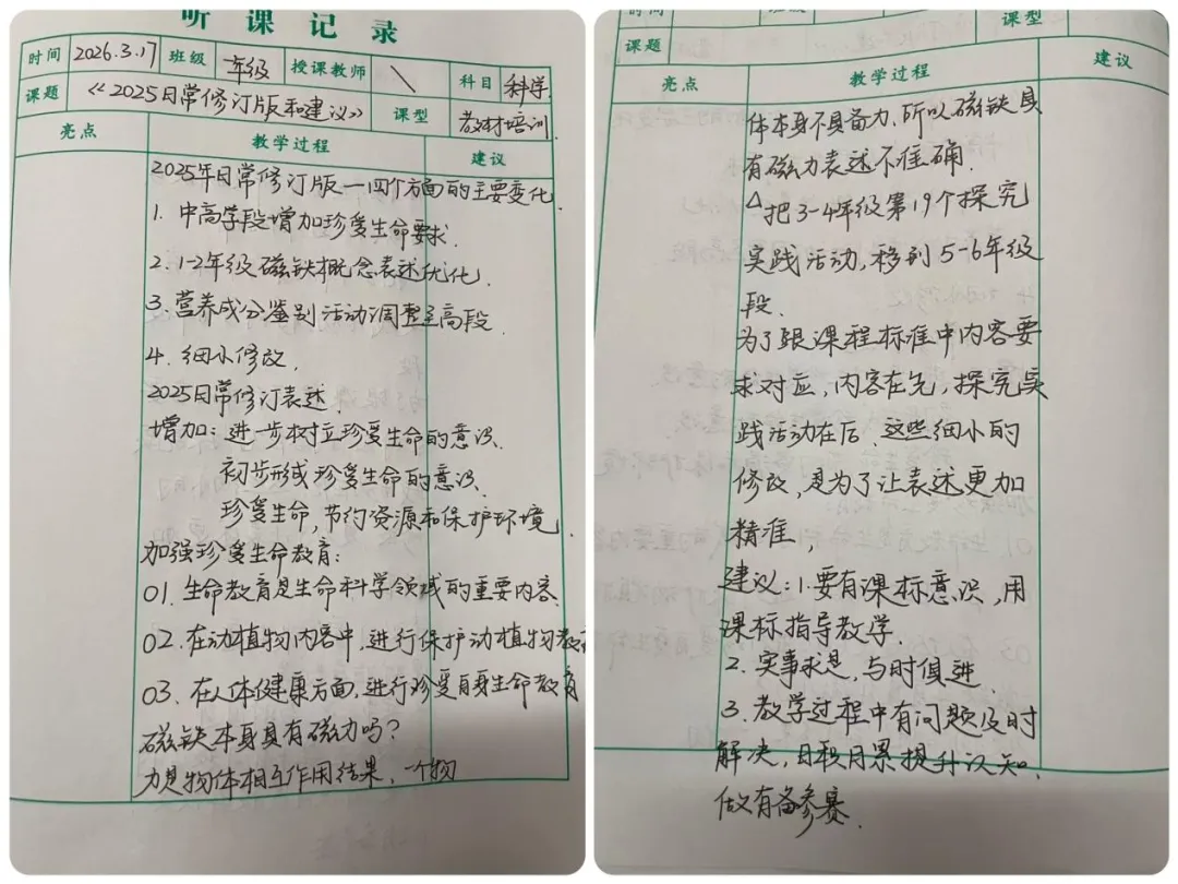 备课组长领学课标,结合质量分析剖析科学思维显性化路径;分年级组解读教材:1-2年级聚焦课堂常规与观察能力,研讨手绘任务单;3-4年级围绕对比实验规范化,探讨变量控制;5-6年级着眼单元整合,推动知识迁移;各年级分享“开学第一课”创意,利用热点唤醒思维,并围绕实验实操、记录单优化、分层教学深入研讨。
