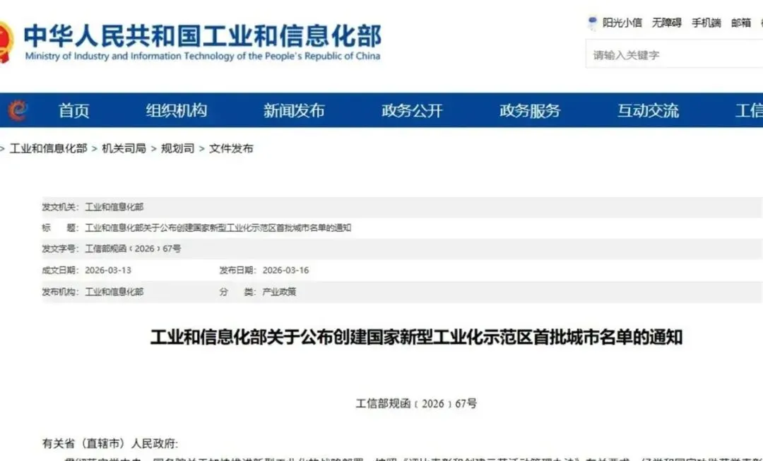 你可能还在怀念郑州国棉厂里纺织女工忙碌的身影,但国家已经给这座古老商都派发了全新的“二次创业”邀请函。 2026年3月16日,工业和信息化部公布创建国家新型工业化示范区首批城市名单,郑州与北京、上海、深圳等16个顶尖城市并肩入选。