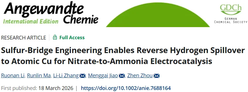 2026年03月18日,郑州大学周震、焦梦改、张利利团队在Angewandte Chemie International Edition期刊发表题为“Sulfur-Bridge Engineering Enables Reverse Hydrogen Spillover to Atomic Cu for Nitrate-to-Ammonia Electrocatalysis”的研究论文,团队成员李若男为论文第一作者,周震、焦梦改、张利利为论文共同通讯作者。