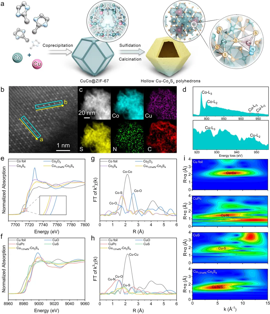 图1 (a) 催化剂合成示意图。(b) Cu₁.₀₁wt%-Co₃S₄的放大HAADF-STEM图像,(c) 相应的元素分布图,以及(d) EELS谱图。(e) Co K-edge和(f) Cu K-edge XANES谱图,(g) Co K-edge和(h) Cu K-edge EXAFS谱图,以及(i) Cu₁.₀₁wt%-Co₃S₄和参考样品的WT-EXAFS Cu K-edge谱图。