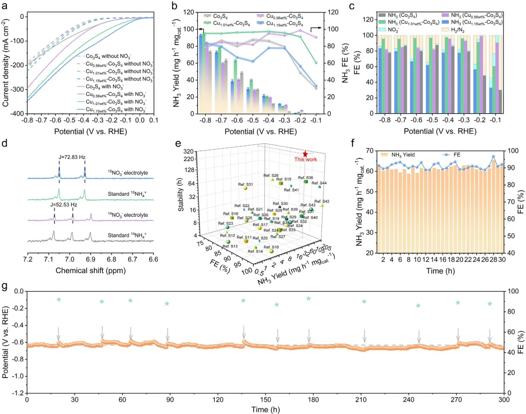 总之,该研究开发了一种双活性中心,其特点是具有硫桥锚定的原子Cu位点嵌入Co₃S₄框架中,这能够实现高效的硝酸盐电催化还原为氨。最佳负载量的Cu单原子作为硝酸盐吸附和活化的主要位点,同时通过电子调控Co₃S₄载体促进水分解,从而生成活性氢物种。这种协同效应使得后续通过硫桥的反向氢溢流成为可能,其中活性氢迁移到Cu位点以促进含氮中间体氢化生成氨。值得注意的是,Cu₁.₀₁wt%-Co₃S₄催化剂实现了卓越的硝酸盐-to-氨转化效率,在-0.8 V下氨产率达到94.52 mg h⁻¹ mgcat⁻¹ (18.90 mg h⁻¹ cm⁻²),法拉第效率为95.18%。此外,该研究在工业电流密度-200 mA cm⁻²下表现出超过300小时的卓越稳定性,并在锌-硝酸盐电池应用中展现出巨大潜力。该工作提出了一种有效的双重优化策略,同时增强了中间体活化和氢化动力学,为设计高性能硝酸盐还原电催化剂提供了宝贵见解。